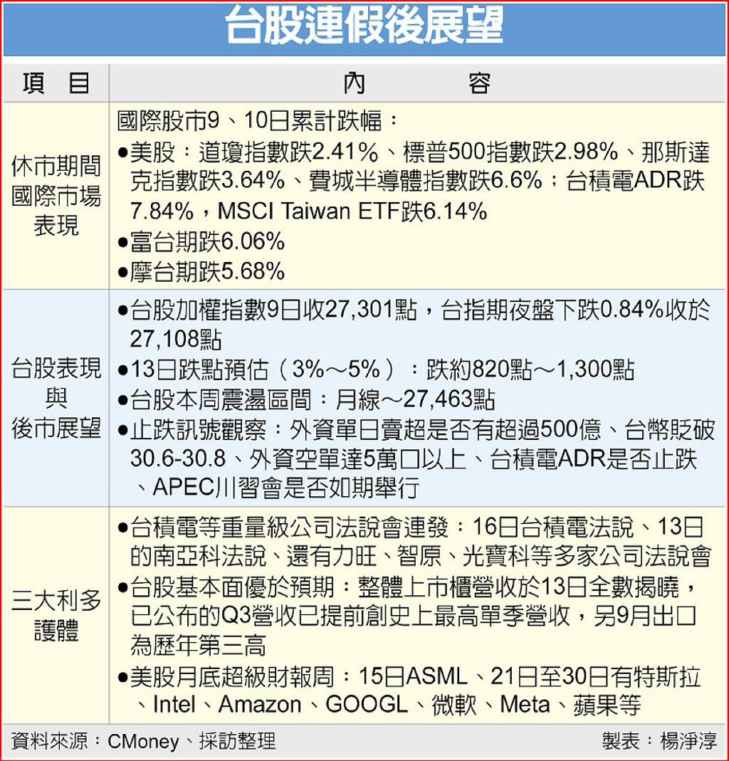 台股雙十假期間,富台期連兩日累計重挫6.06%,在美掛牌的MSCI Taiwan ETF亦跌6.14%。以台股9日收盤27,302點推算,若跌至26,000點,等同下跌1,302點、跌幅達4.77%,法人普遍預估開盤跌幅約3∼5%,盤中跌點落在820∼1,300點之間。