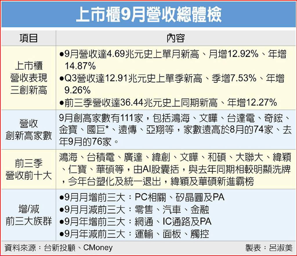 上市櫃9月營收一舉衝上4.69兆元新高、月增12.92%、年增14.87%,9月營收創高家數也衝上111家今年最旺,第三季旺季效應超出市場原先預期,單季營收衝上12.91兆,以及前三季飆高音至36.44兆元,與9月營收表現,三創歷史同期新高。