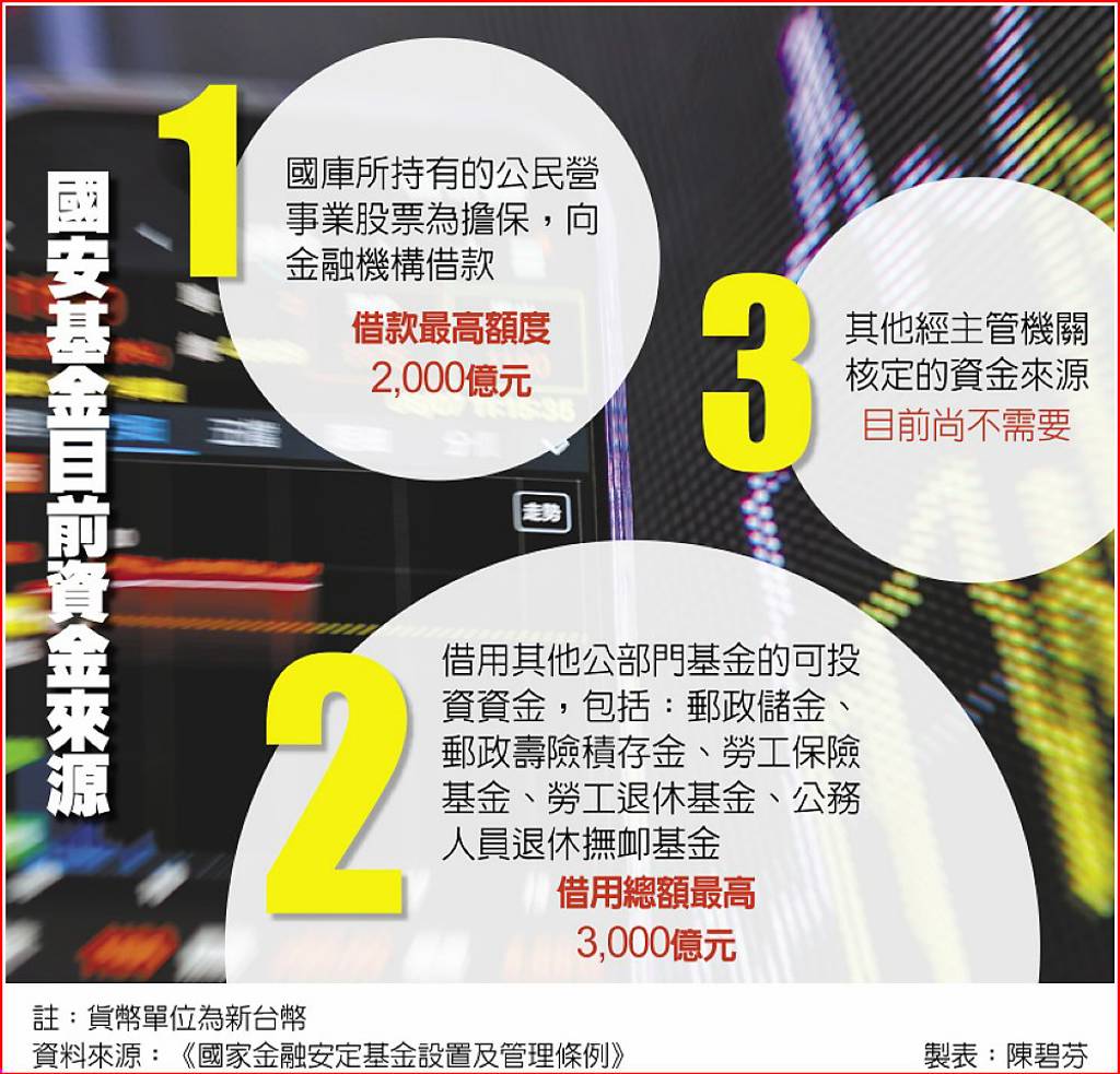 據國安基金設置及管理條例第四條規定,國安基金可運用資金總額5,000億元,來源有三項: