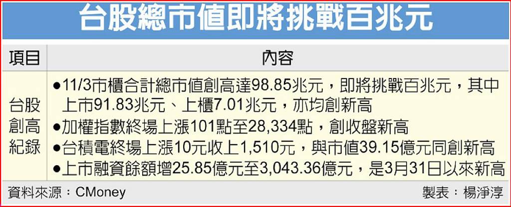 台股11月開局第一天盤中震幅加大,尾盤在台積電拉升下,推升加權指數翻紅上漲101點收歷史最高收盤價28,334點,市櫃合計市值跟著翻升創新高至98.85兆元。市場推估,當台積電達標1,555元,台股上市櫃市值將衝百兆元。