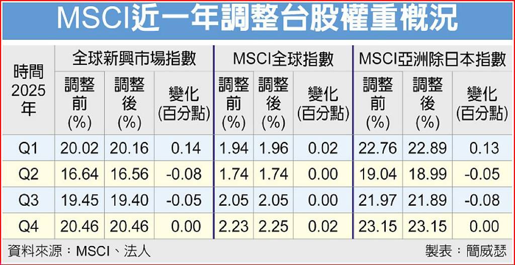 MSCI¥b¦~«×½Õ¾ã¥XÄl¡A¥xªÑ¦b¥»¦¸MSCI½Õ¾ãÅv«¤¤¡A©óMSCI¥þ²y¥«³õ«ü¼ÆÅv«¥Ñ2.23¢H¤W½Õ¦Ü2.25¢H¡F¦bMSCI¥þ²y·s¿³¥«³õ«ü¼Æ¡BMCI¨È¬w°£¤é¥»«ü¼ÆÅv«§¡«ù¥¡A¥»¦¸½Õ¾ã¤@¤É¤G«ù¥¡A¤¤©Ê°¾¥¿±¦¨ÁZ§Uº¦6¤é¥xªÑ¡A³Ì·sÅv«±N¦b24¤é½L«á¥Í®Ä¡C