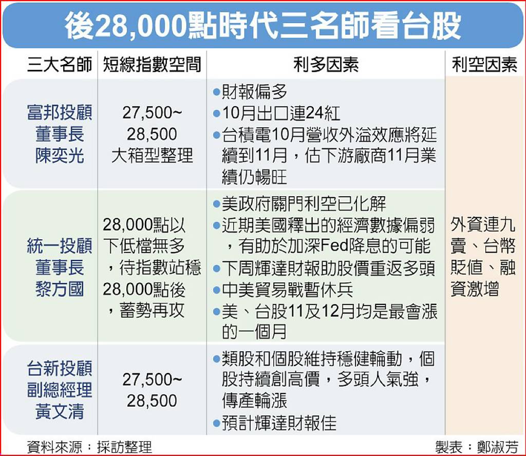 然三大名師對後市看法中性偏多。台新投顧副總經理黃文清說,權值股漲多回吐賣壓,台股驚險收復月線,但加權指數連六個交易日未能站上28,000點、漲幅前五大個股均傳產股看來,資金有朝傳產避險味道。另台股近期屢留上影線,顯見攻高無力、短線以高檔震盪為主,指數約在月線或28,000點上下500點擺盪。