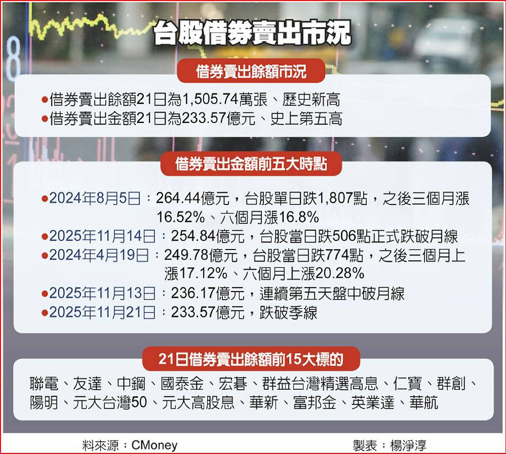 陳奕光指出,21日借券賣出金額高達233.57億元、為史上第五大;回顧前四次紀錄,皆出現在台股大幅重挫或跌破重要均線之際,但三至六個月後台股多數強勢反彈。例如史上最大量的2024年8月5日,台股當日暴跌1,807點,但三個月後反彈16.52%、六個月後漲幅達16.8%。