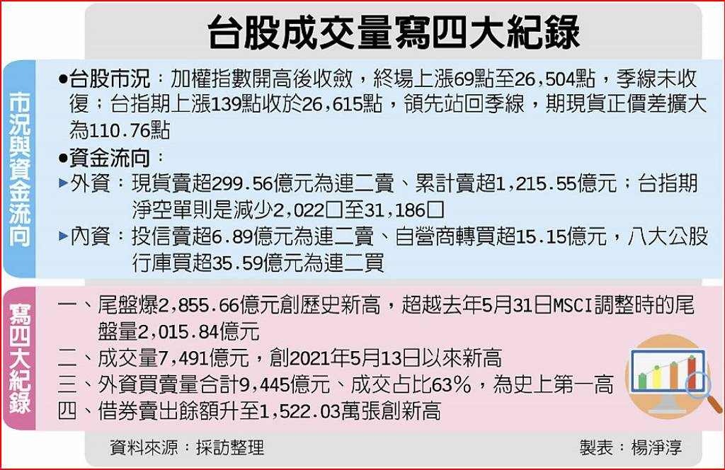 本次MSCI台股權重雖獲調升,惟台積電權重遭調降0.51個百分點至58.03%,尾盤由平盤翻跌10元收1,375元,壓低加權指數由上漲155點收斂為上漲69點,盤勢開高走低,爆出2,855億元史上最大尾盤量,整體成交量至7,491億元,創2021年5月13日來最大量,季線得而復失。