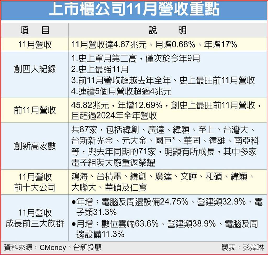 上市櫃公司11月營收10日全揭曉,11月單月達4.68兆元,月增0.68%、年增17.01%,創史上單月營收次高紀錄及史上最強11月,差165億元就打敗9月寫下最強的單月營收;且前11月營收達到45.83兆元,年增12.69%,超越單年史上最高營收2024年的44.79兆元,另上市櫃公司首次以前11月合計數,就刷新單年的史上營收最高。