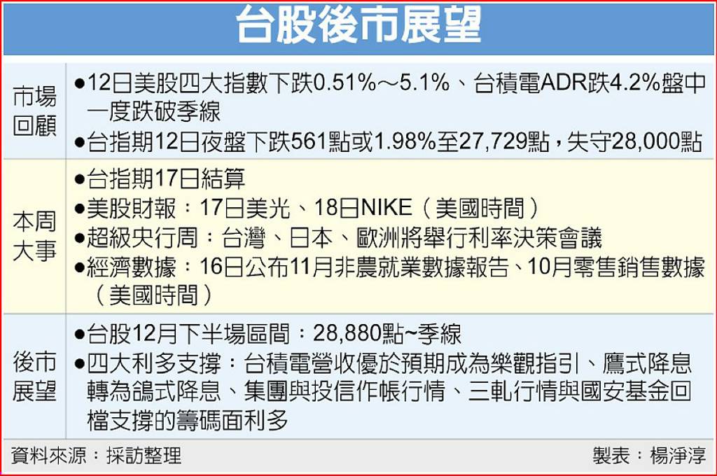 台股本周波動將加劇,台指期17日結算,為今年最後一個月結算日,法人調整部位可能將加大波動,而美股還有美光以及NIKE將公布財報,此外,台、日及歐洲央行會議本周同步登場,日央升息議題引發市場關注,而美國則是要公布11月非農就業數據、10月零售銷售。