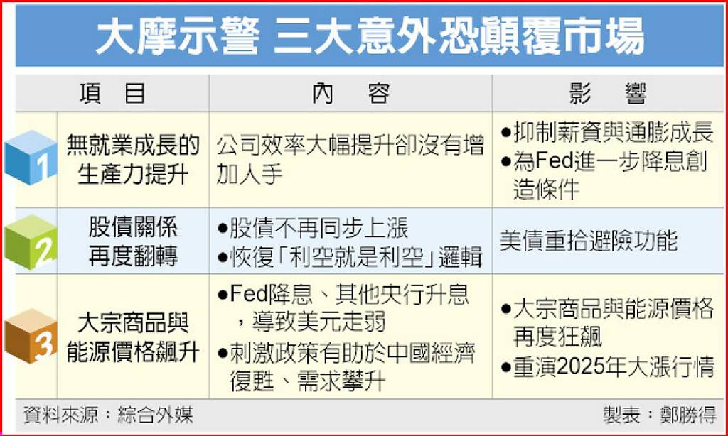 其次,股債關係可能再次翻轉。股債價格通常呈反向走勢,當風險資產下跌時,資金會流向較安全的債券,此趨勢卻在今年遭到顛覆、股債同步穩定上漲。部分原因是股市陷入「壞消息反是好消息」的交易邏輯,經濟數據疲弱強化市場降息預期,進而提振美股表現。但若明年通膨回落至Fed設定目標,該趨勢可能再次翻轉。該行策略師托比亞斯與卡特分析,當通膨預期降至目標水平甚至更低時,對風險資產「利空消息就是利空」的邏輯將回歸,美債避險功能將恢復。